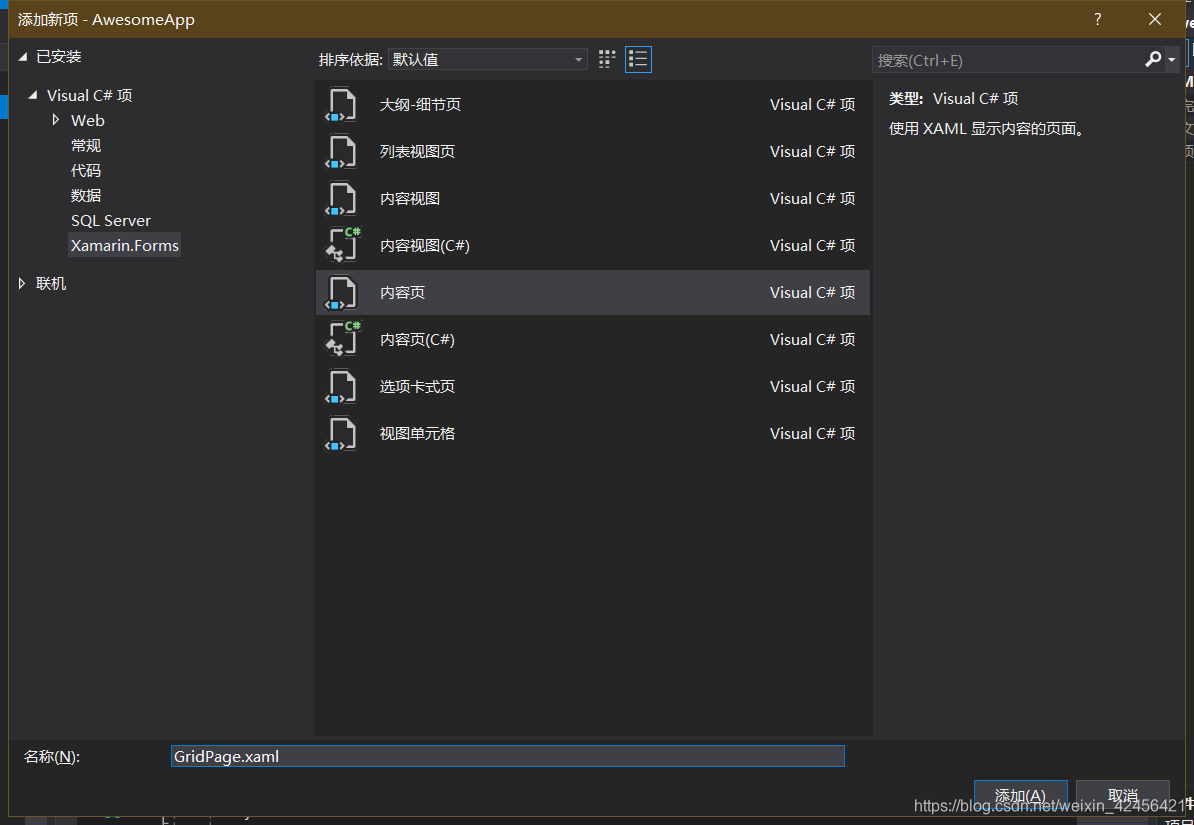 - 添加新项 GridPage.xaml: