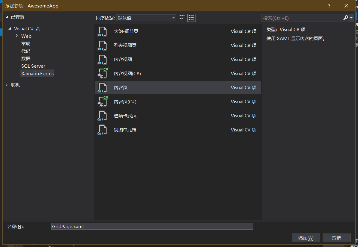 - 添加新项 GridPage.xaml: