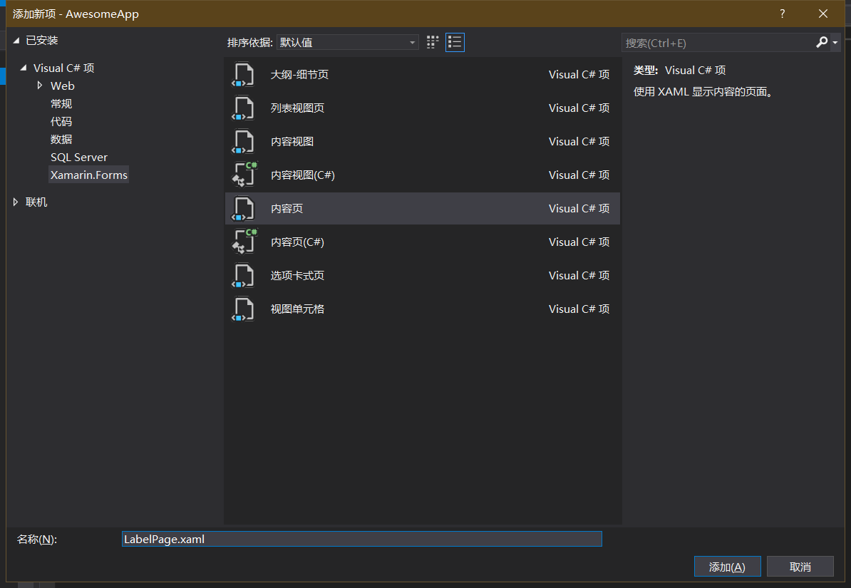 - 在 XAML 中创建 Xamarin.Forms Label。