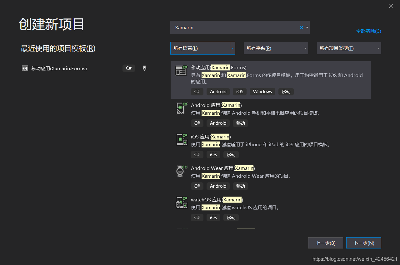 - 搜索“Xamarin”或从“项目类型” 菜单中选择“移动” 。 选择“移动应用(Xamarin.Forms)” 项目类型: