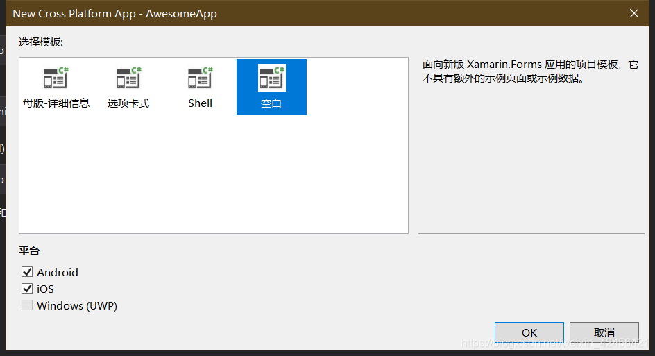 - 单击“空白” 项目类型,确保选择了“Android” 和“iOS” :