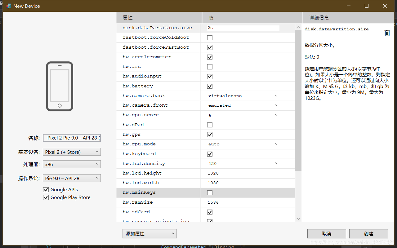 - 在仿真器创建屏幕中,使用默认设置并单击“创建” 按钮: