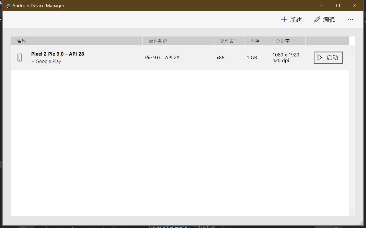 - 创建仿真器会使你返回“设备管理器”窗口。 单击“启动” 按钮以启动新仿真器:
